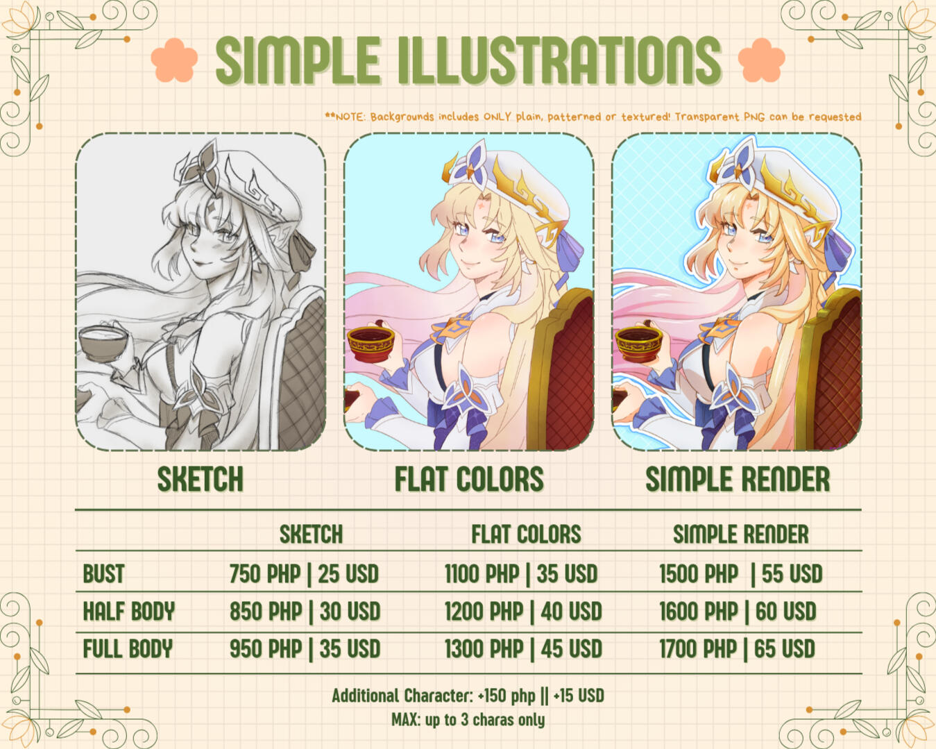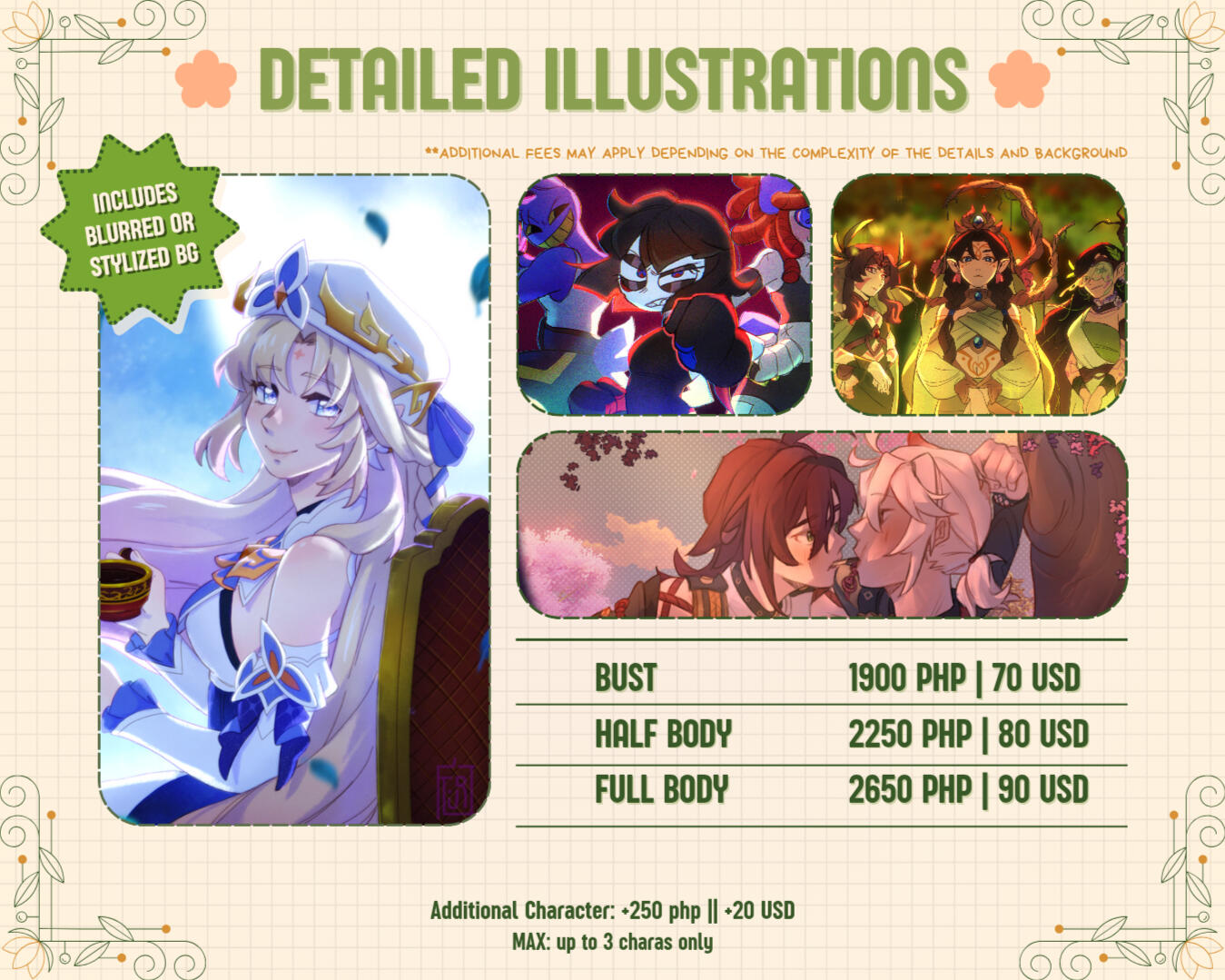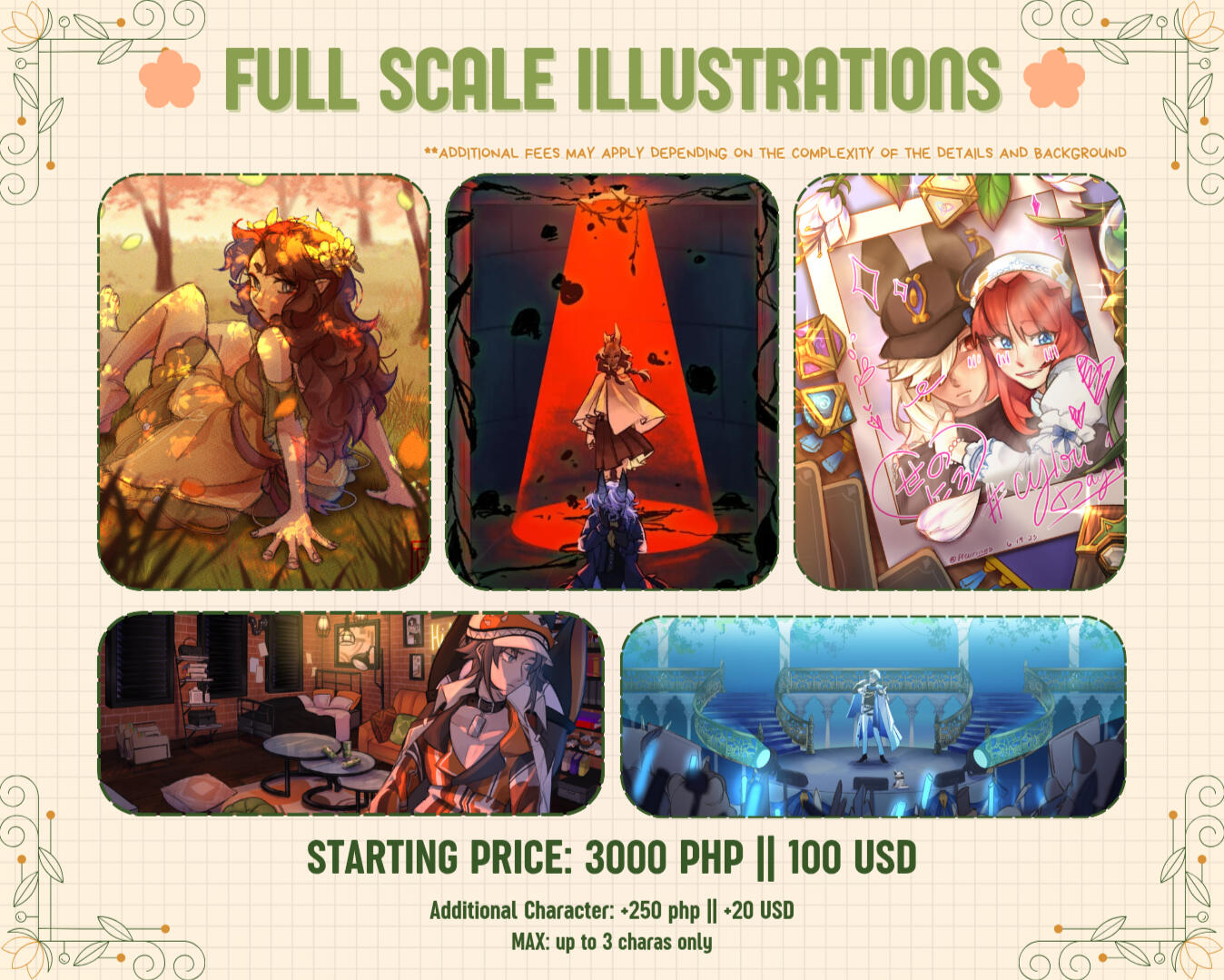 ✤ 50% of the total price must be paid upfront before the artist starts the commission. This will also reserve a slot for the client.